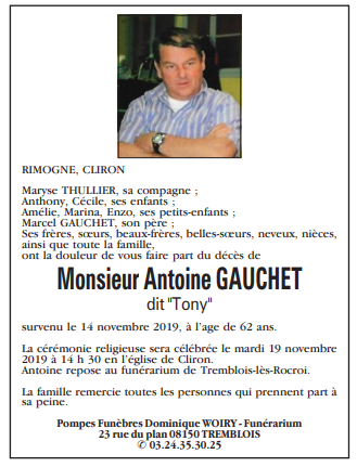 Décédé à Rimogne (08150, France) le jeudi 14 novembre 2019 à l'âge de 62 ans