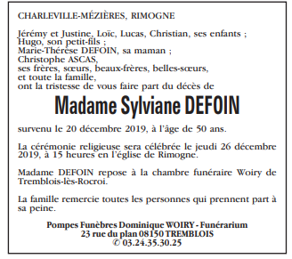 Décédée à Charleville-Mézières (08000, France) le vendredi 20 décembre 2019 à l'âge de 50 ans