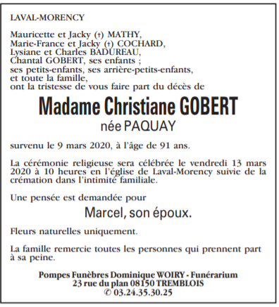 Décédée à Charleville-Mézières (08000, France) le lundi 9 mars 2020 à l'âge de 91 ans