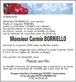 Décédé à Sormonne (08150, France) le lundi 6 janvier 2020 à l'âge de 85 ans