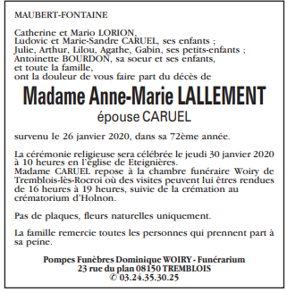 Décédée à Charleville-Mézières (08000, France) le dimanche 26 janvier 2020 à l'âge de 71 ans