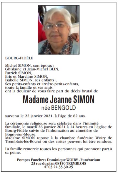 Décédée à Charleville-Mézières (08000, France) le vendredi 22 janvier 2021 à l'âge de 82 ans