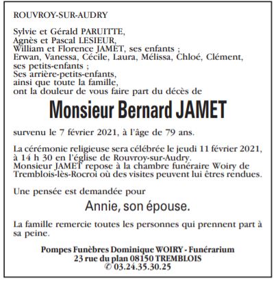 Décédé à Charleville-Mézières (08000, France) le dimanche 7 février 2021 à l'âge de 79 ans