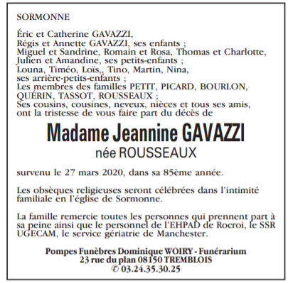 Décédée à Rocroi (08230, France) le vendredi 27 mars 2020 à l'âge de 84 ans