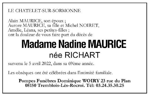 Décédée à Le Châtelet-sur-Sormonne (08150, France) le mardi 5 avril 2022 à l'âge de 68 ans